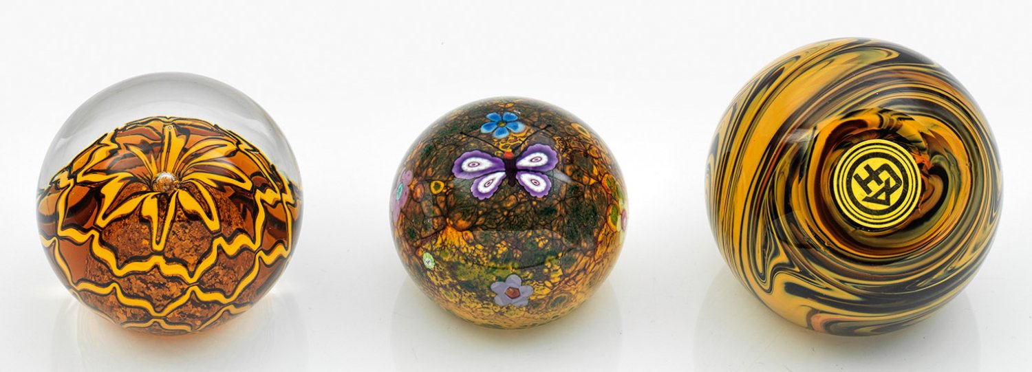 Drei honigfarbene Paperweights Farbloses Glas. Kugelig. Abstrakt gestaltete, honig-, ocker- und gelbfarbene Einschmelzungen in Form von Wellen oder in Kröseltechnik sowie ein lilafarbener Schmetterling und blaue Blüten aus Millefiori-Canes. Teilw. mit Monogramm. Ein Paperweight mit Herstellersignatur, bez. und dat. 1980; Teilw. minim. best.; H. 5,6 cm - 7,5 cm.