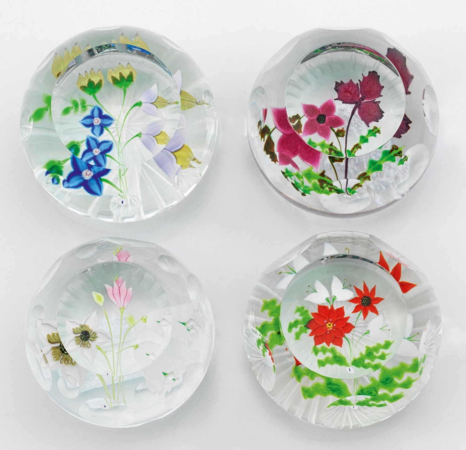 Vier florale Paperweigths aus limitierten Editionen. Farbloses, facettiert geschliffenes Glas. Halbrund. Über einem sternförmig geschliffenen Grund polychrom eingeschmolzene Blumenbouquets jeweils passend zu einer der vier Jahreszeiten. Betitelt, nummeriert, Herstellergravur. H. 5 cm - 5,3 cm.