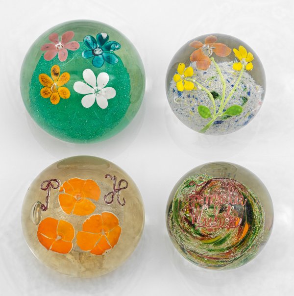 Vier Paperweights Farbloses Glas. Kugelig bzw. eiförmig. Über polychromem Kröselkissen Ziereinschmelzungen in Form von stilisierten Blüten und Besitzermonogr. Minimale altersbedingte Gebrauchsspuren. H. 6,5 cm - 7,5 cm.