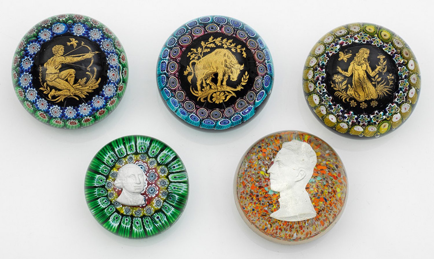 Fünf Paperweights Farbloses Glas. Kugelig. Polychrome Ziereinschmelzungen, u. a. drei mit Goldpulver auf schwarzem Grund dargestellte Sternzeichen Stier, Jungfrau und Schütze, umgeben von polychromem Millefiori-Dekor. Minim. altersgemäße Gebrauchsspuren. H. 4,7cm - 5,7 cm.