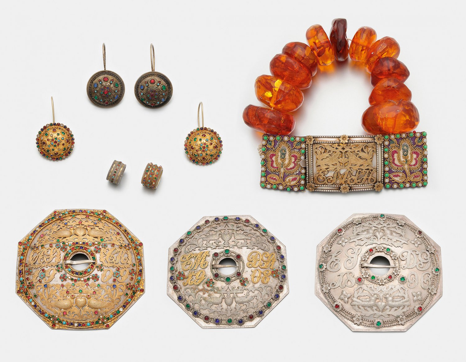 Bückeburger-Hochzeitsschmuck von 1896, 1908 und 1909 Schaumburg-Lippe. 8-tlg.; Silber, teilw. vergoldet. Drei oktogonale, konvex gewölbte Brustspangen, schauseitig mit Applikationen aus affrontierten Vogelpaaren in Blattrankenkartuschen, bekrönt von fünfzackiger Krone sowie Allianz Monogramm und facettierten Farbsteinen. Übergroße korrespondierende Ohrgehänge und Bandringe. Kette aus übergroßen facettierten Bernsteinkugeln und prächtiger korrespondierender Schließe, flankiert von gestickten Blüten. Ketten-Gew. ca. 498 g., Brustschmuck- , Ringe und Ohrringe-Gew. ca. 514 g.