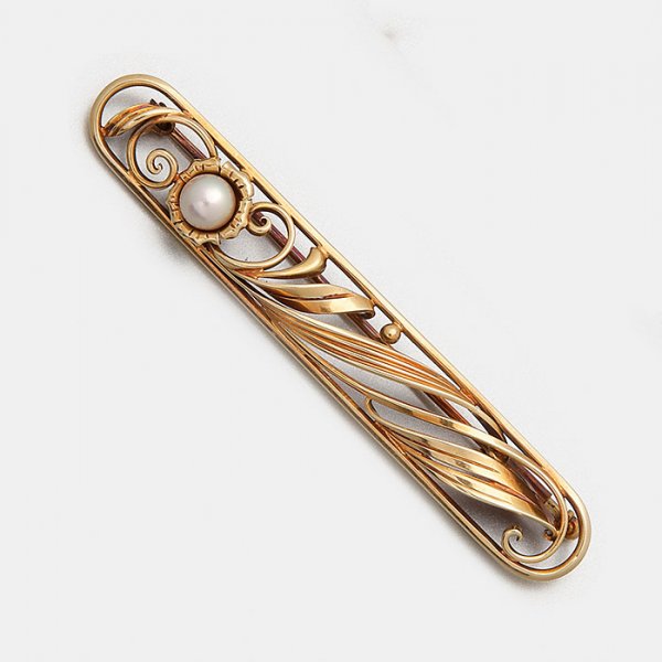 Perlbrosche aus den 30er Jahren Gelbgold, gest. 585. Stabform mit Blattwerk in Ajour, besetzt mit einer weißen Zuchtperle. Gew. ca. 5,80 g.