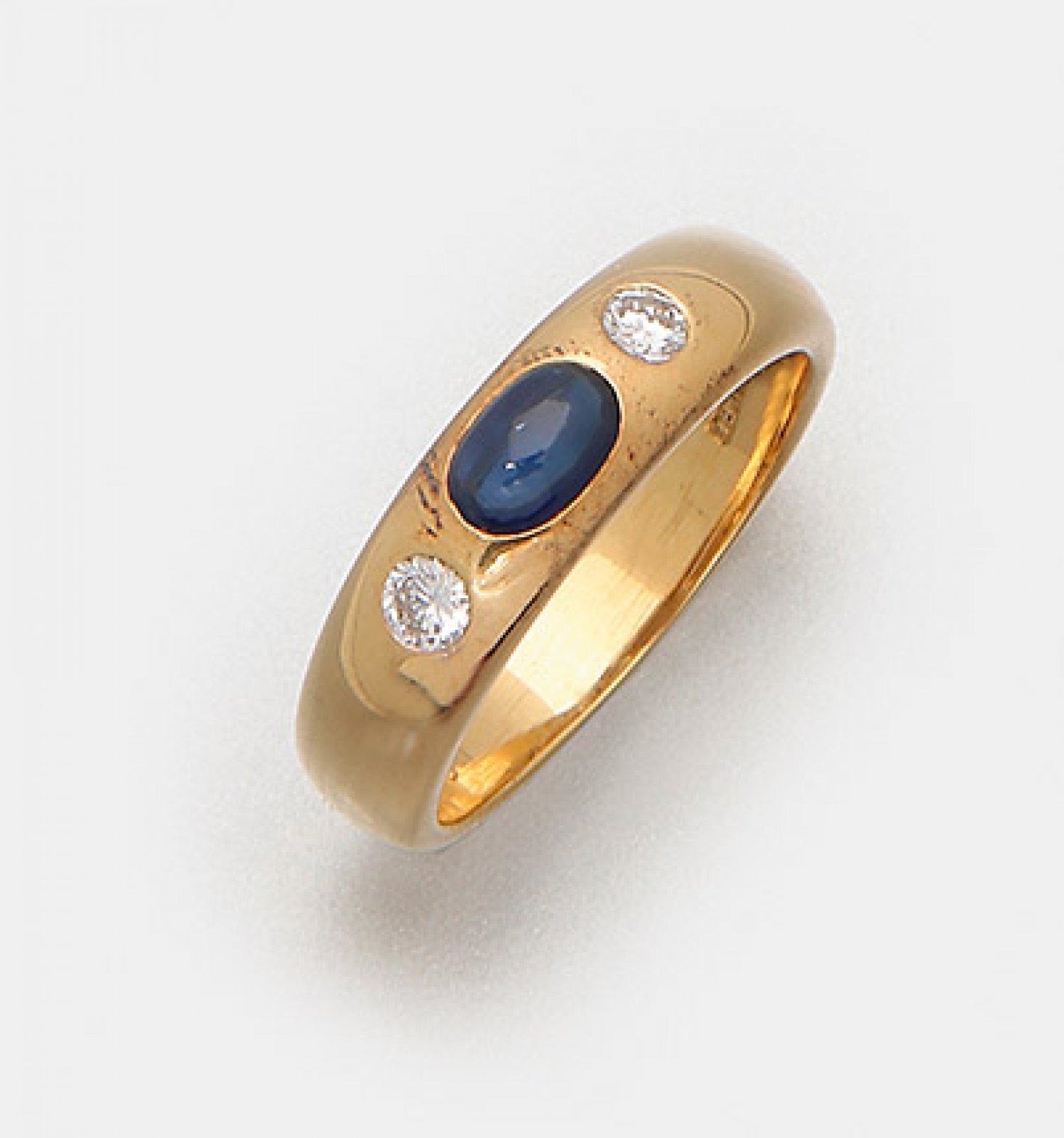 Klassischer Saphir-Bandring von WEMPE Gelbgold, gest. 750. Zentral besetzt mit einem Saphircabochon von ca. 0,69 ct., flankiert von zwei Brillanten von zus. ca. 0,18 ct. (F-G/if). Gew. ca. 6,35 g.