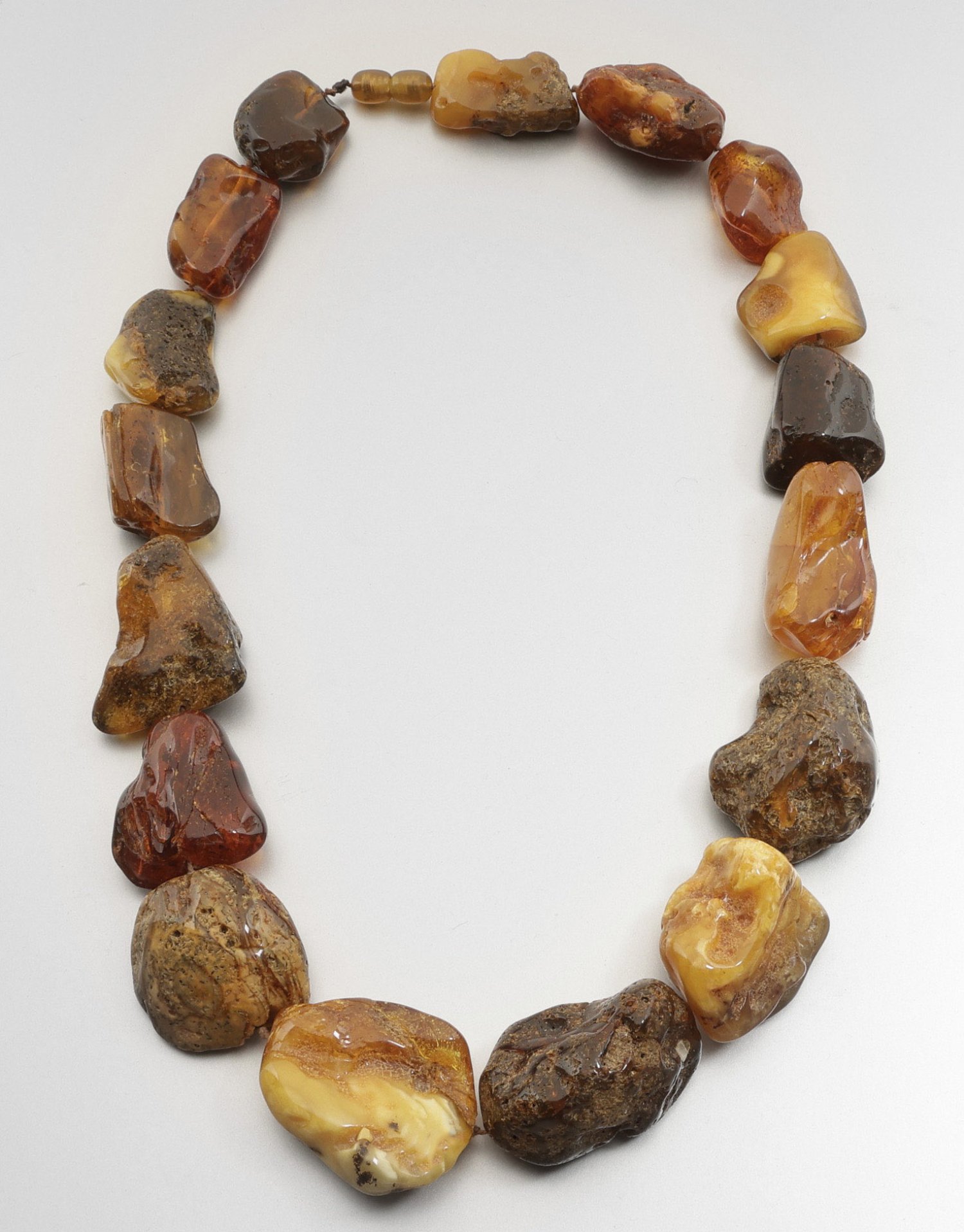 Multicolor Bernsteinkette aus den 60er Jahren Einreihige, leicht verlaufende Kette aus braunen, butterscotchfarbenen und orangegelben Bernstein-Nuggets. L. 55 cm. Gew. ca. 133,82 g.