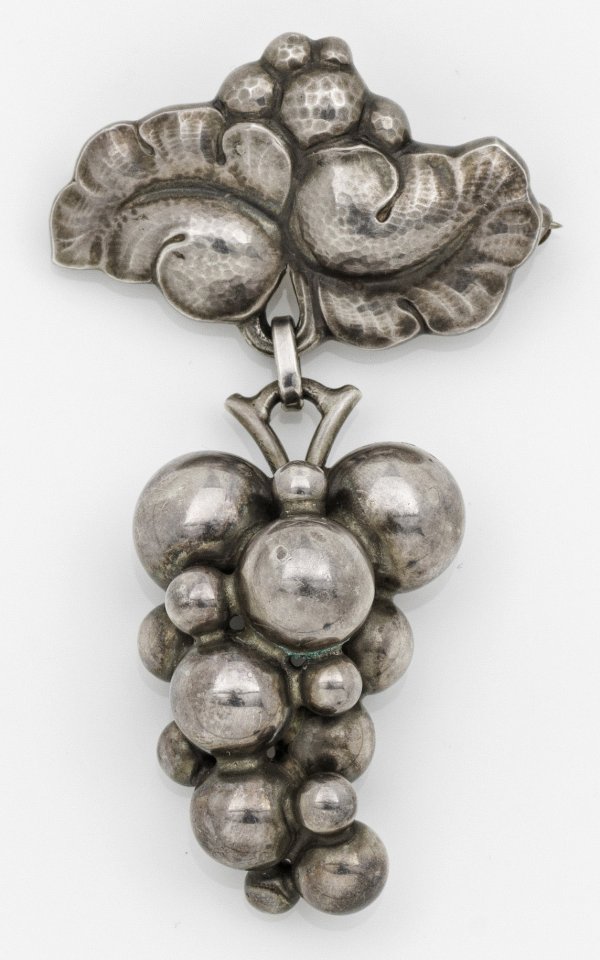 Brosche "Moonlight Grapes" von H. Nielsen für Georg Jensen Dänemark, nach 1945. Silber, gest. 925. Vollplastisch gearbeitete Brosche in Form einer Weinrebe mit Blattwerk. Herstellerzeichen. Sehr feine Silberschmiedeausführung nach einem Entwurf von Harald Nielsen aus den 1920er Jahren.