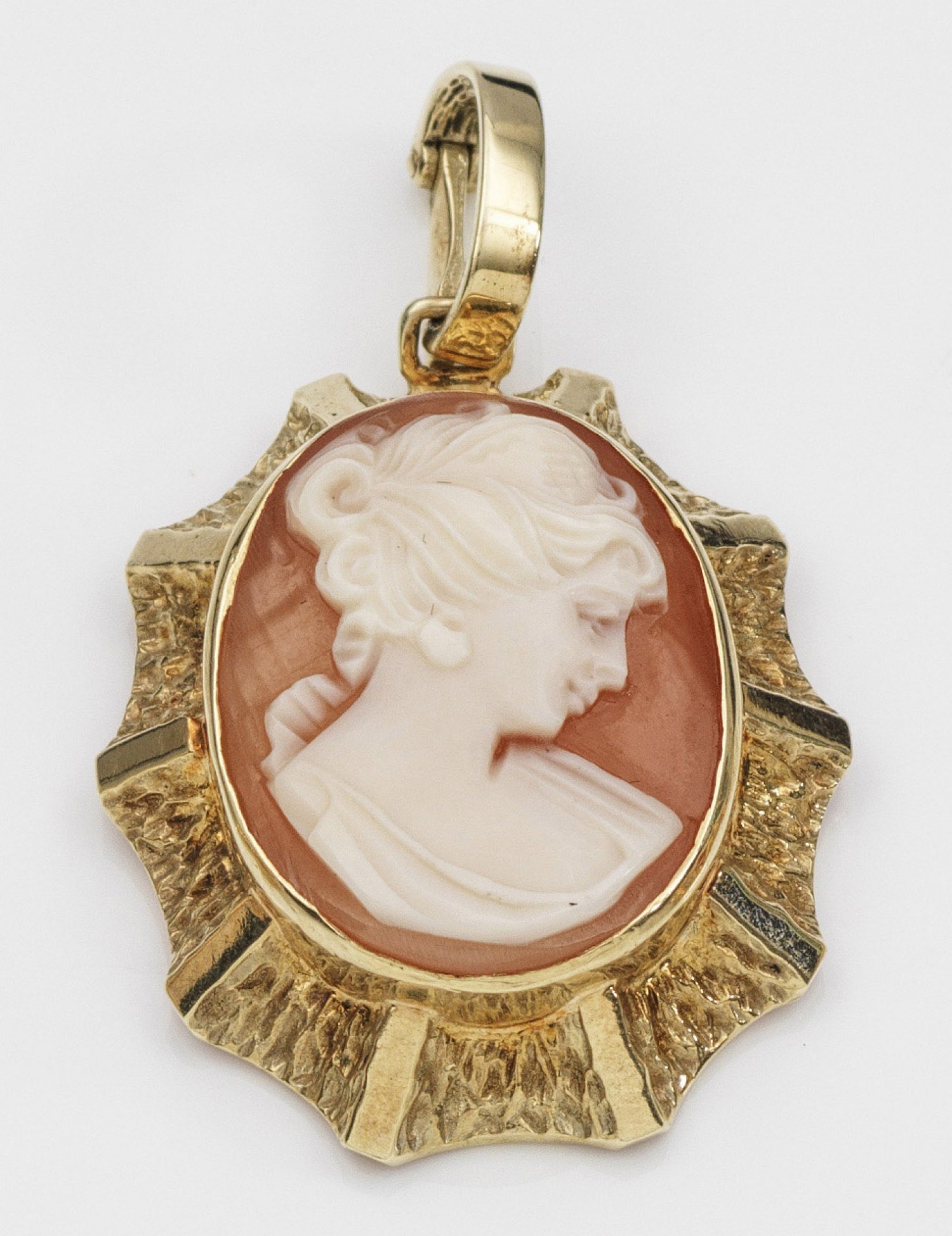Muschelkamee-Anhänger Gelbgold, gest. 585. Zentral besetzt mit einem ovalen Medaillon, darin fein geschnittenes Porträt einer jungen Dame. Gew. 9,60 g.