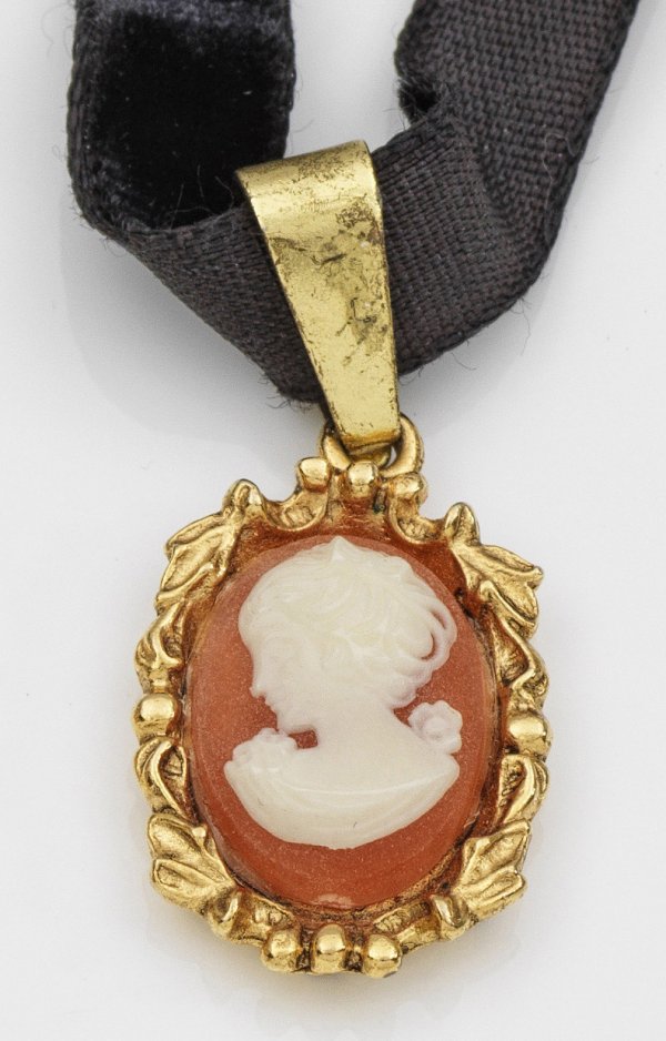 Muschelkamee-Anhänger Gelbgold, 8 ct.; Ovales Medaillon mit fein geschnittenem Porträt einer jungen Dame. An schwarzem Samtband. Gew. 6,01 g.