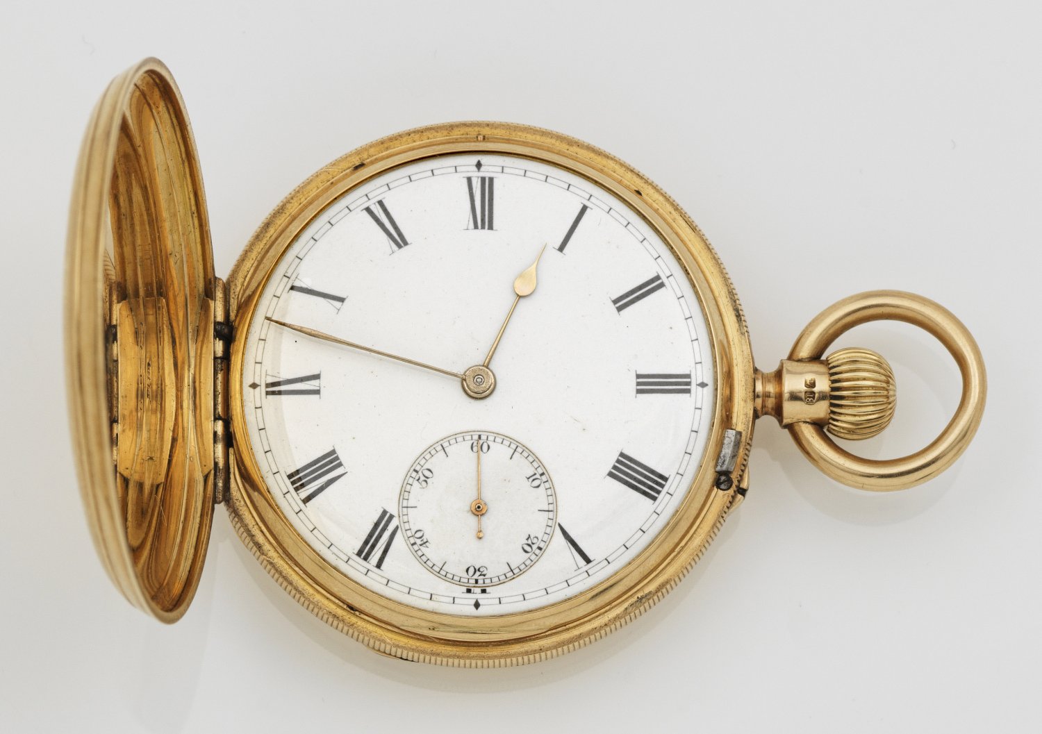 Savonette-Taschenuhr von J.A. Webber, London England. Um 1956. Gelbgold, 18 ct.; Fein guillochiertes 3-Deckelgehäuse, weißes Emailzifferblatt mit schwarzen römischen Zahlen und Birnzeiger, kleine Sekunde. Mechanisches Werk mit Handaufzug. D. 5 cm. Gew. ca. 125,02 g.