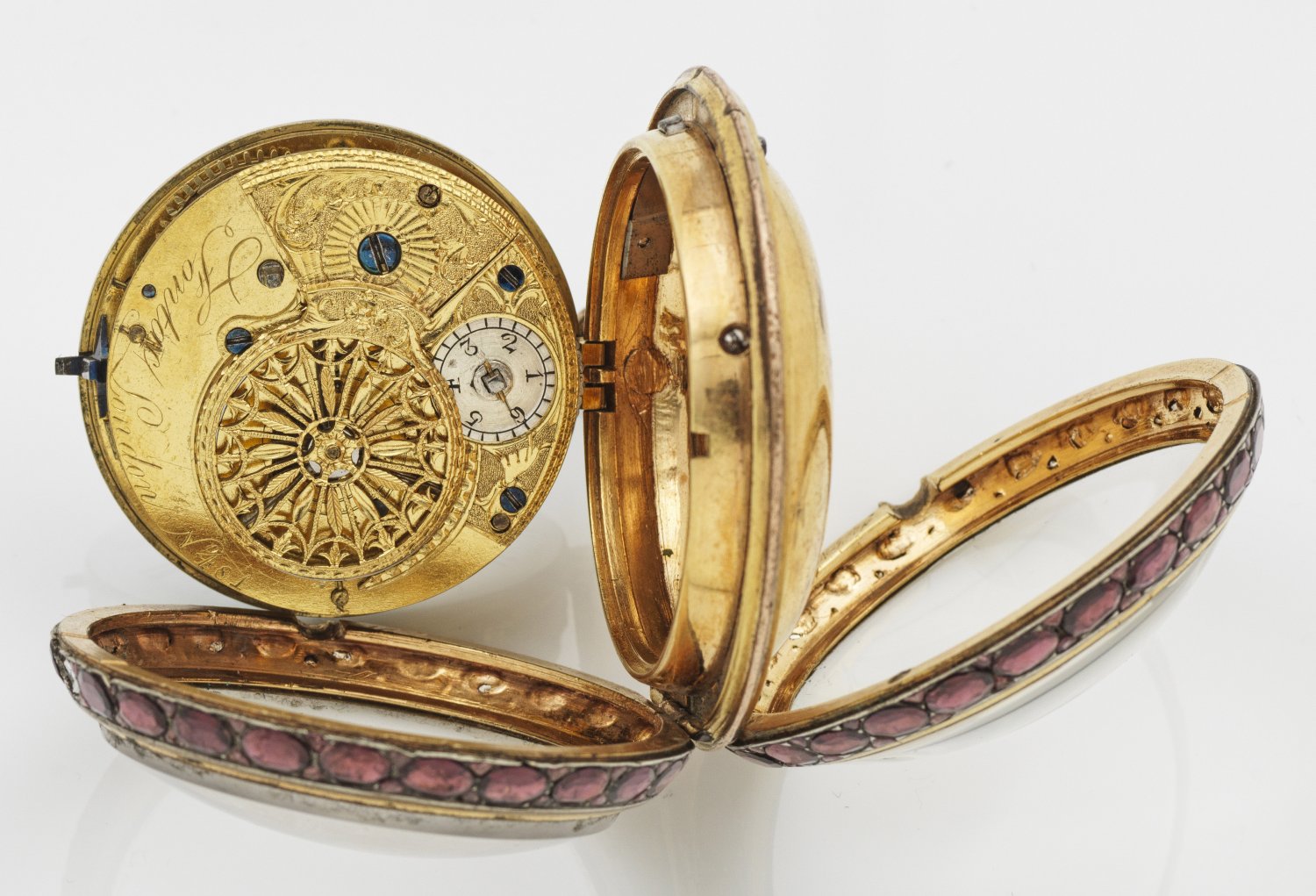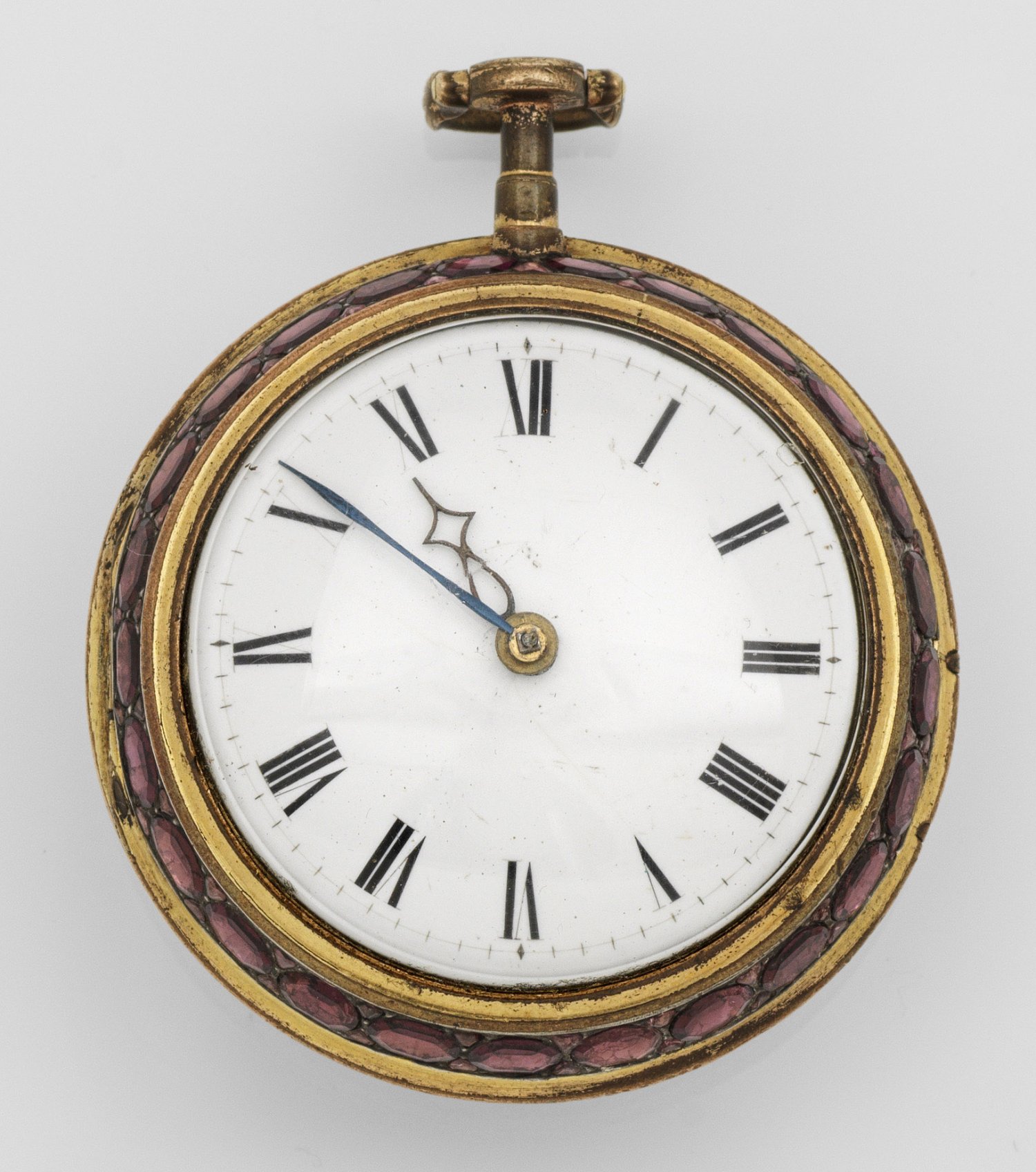 Englische Spindel-Taschenuhr von Fontad 2. H. 18. Jh.; Metall, vergoldet. Bombiertes Gehäuse, umlaufend besetzt mit facettierten, dunkelrosa unterlegten Steinen. Weißes Emailzifferblatt mit schwarzen römischen Zahlen, Dauphinzeiger. Fein zieseliertes Spindelwerk mit Kette und Schnecke, Schlüsselaufzug. Bez. Fontad, London No. 481. D. 5,5 cm.