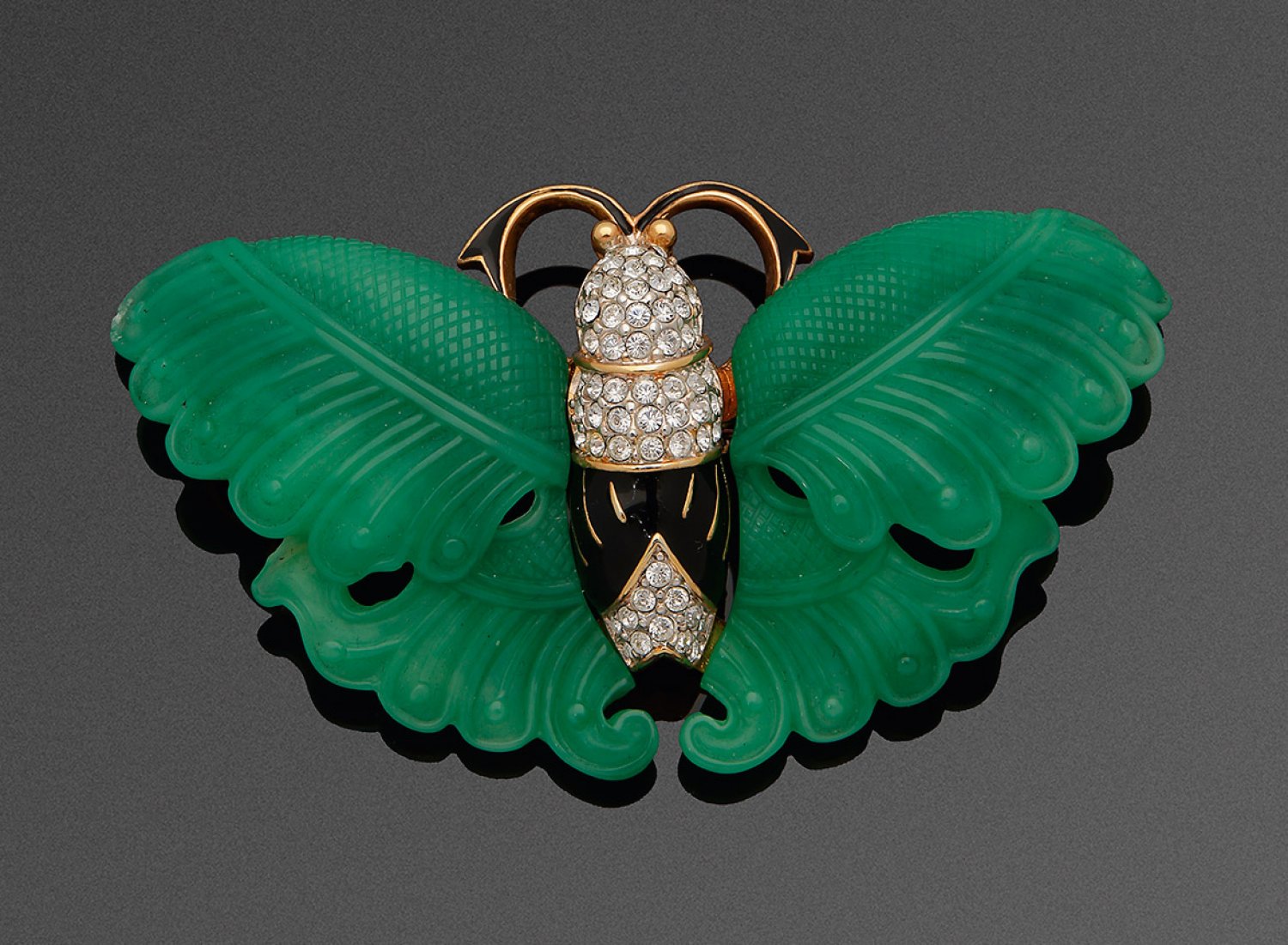 Schmetterlingbosche von Kenneth Jay Lane aus den 90er Jahren Metall, vergoldet, teilw. schwarz emailliert. Besetzt mit Strasssteinen und hellgrünem Jade-Imitat. Herstellerzeichen.