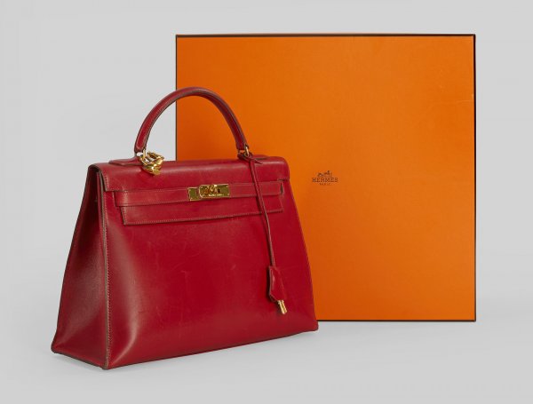 Hermès-Handtasche "Kelly Bag 32" von 1993 Rotes Box-Kalbsleder und vergoldete Hardware. Zwei kleine Innenfächer sowie ein Reißverschlussfach. Blindstempel 7 R 15 R W im Kreis. Breiter Schultergurt sowie vergoldeter HERMÈS-Pelikananhänger. Hersteller-Logo. Schlüssel-Nr. 062. Gebrauchsspuren. Ohne Schloss. Original-Karton. Ges.-H. 32 cm. 32 cm x 12 cm.