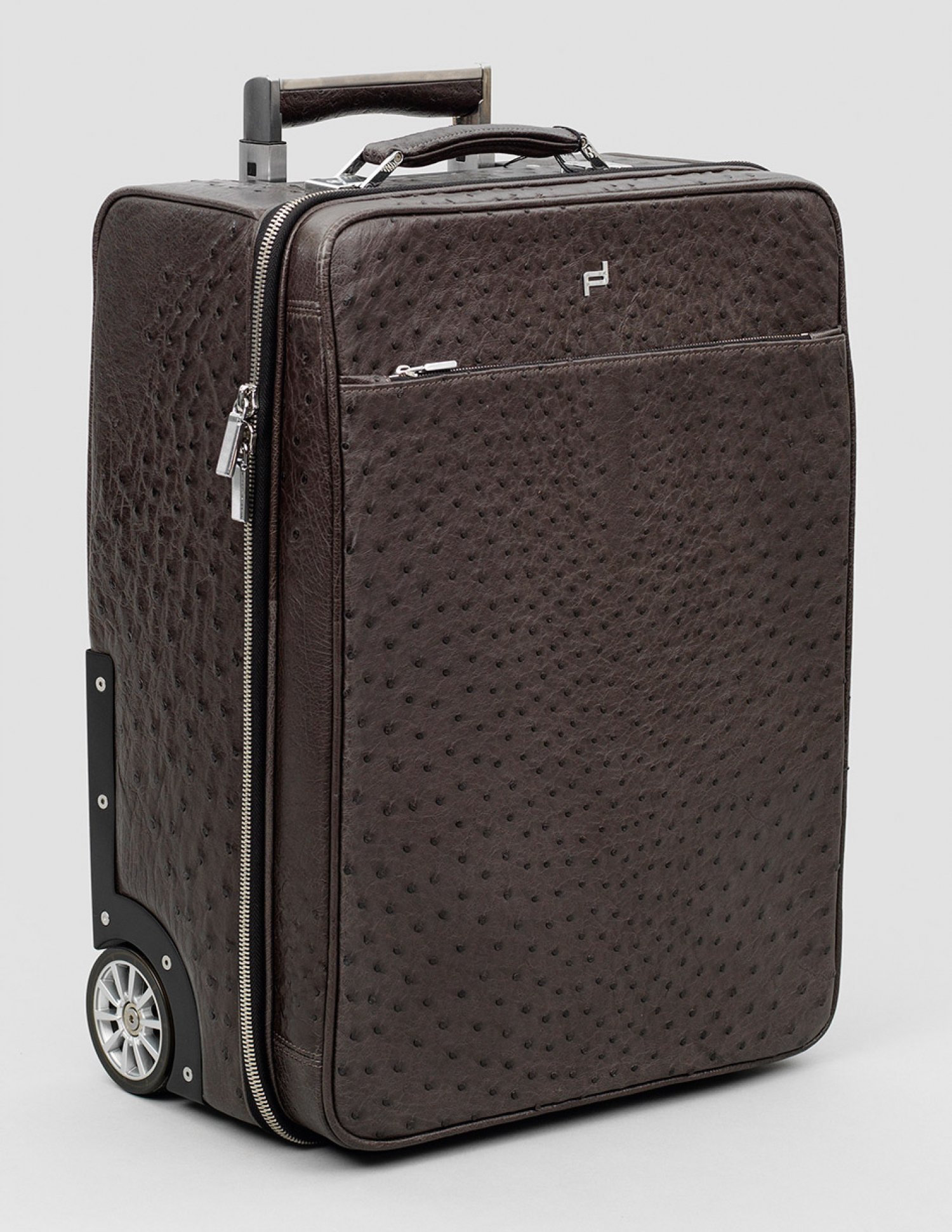 Porsche Design-Reisetrolley "510" Anthrazitfarbenes Straußenleder. Rechteckiger Korpus auf zwei Rollen, Trageriemen und ausziehbarer Handzug, außen wie innen Facheinteilung mit Reißverschluss. Herstellerzeichen. Originaler Staubbeutel. Neuwertig. Neupreis ca. € 13.000,-. H. 49 cm. 34 cm x 20 cm.