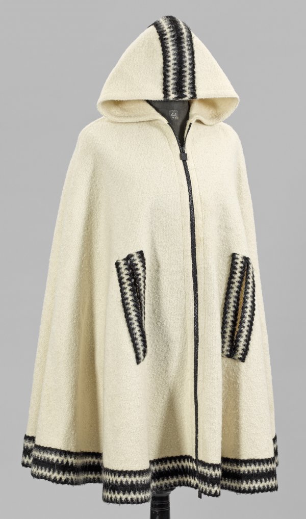 Cape von CHANEL Wolle und Alpaka. Cremefarbener, glockenförmig geschnittener Umhang mit Reißverschluss, Kapuze und Einschnitten für Hände. Breite, schwarz-cremefarbene Zackenbordüre. Herstellerzeichen. Gr. 34.