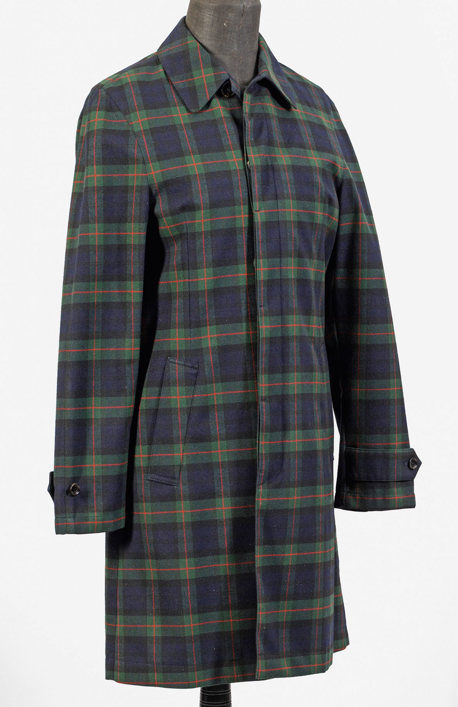Mantel von GUCCI Knielanger, gerade geschnittener Mantel in klassischem blau-, grün-rotem Karomuster mit seitlichen Eingrifftaschen. Auf dem Rücken große Applikationen eines Hasens und Blütenzweige in Schwarz. Hellblaues Innenfutter. Herstellerzeichen sowie Made in Italy und Verkaufsetikett. Gucci-Kleidersack. Ungetragen. Gr. 46. Mantel-L. 102 cm.