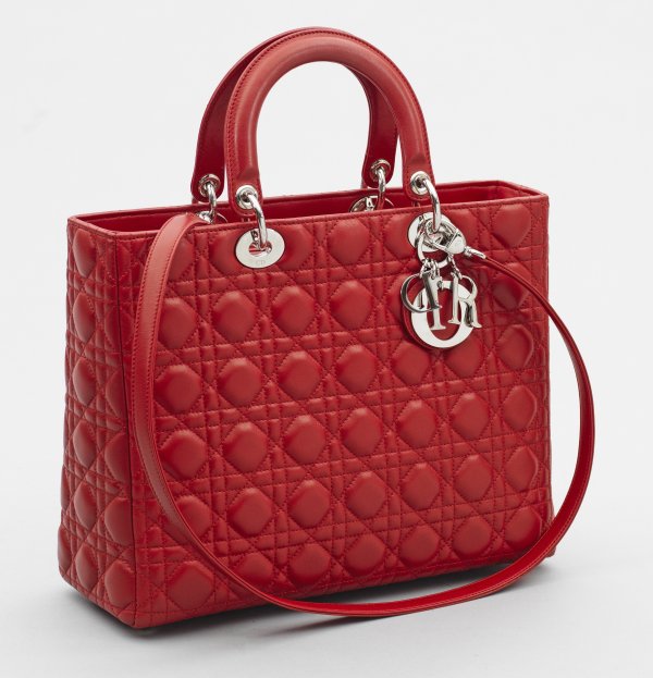 "Lady Dior"-Handtasche Rotes Kalbsleder mit sog. "Cannage"-Absteppung. Hardware mit Silber-Finish. Innen großes und kleines Fach. D.I.O.R Anhänger sowie abnehmbarer Trageriemen. Serien-Nr. 01-MA-0151. Hersteller-Logo sowie Made in Italy. Nahezu ungetragen. Ges.-H. 38 cm. 32 cm x 11cm.