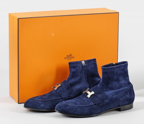 Paar "Saint-Honoré"-Stiefeletten von HERMÈS Marineblaues Veloursleder. Klassische Loafer-Form mit H-Logo, in Stretch-Schaft mit Reißverschluss übergehend. Herstellerzeichen sowie Made in Italy. Gr. 40. Staubbeutel und Original-Box. Wenig getragen.