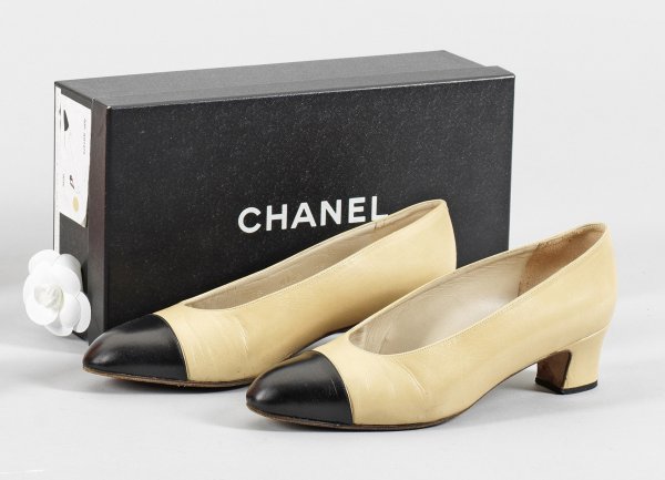 Paar klassische Pumps von CHANEL Cremefarbenes und schwarzes Leder. Klassisch geschnittener Damenschuh mit kontrastierender Spitze. Herstellerzeichen. Gr. 39. Staubbeutel sowie Karton mit Chanel Kamelie. Getragen.