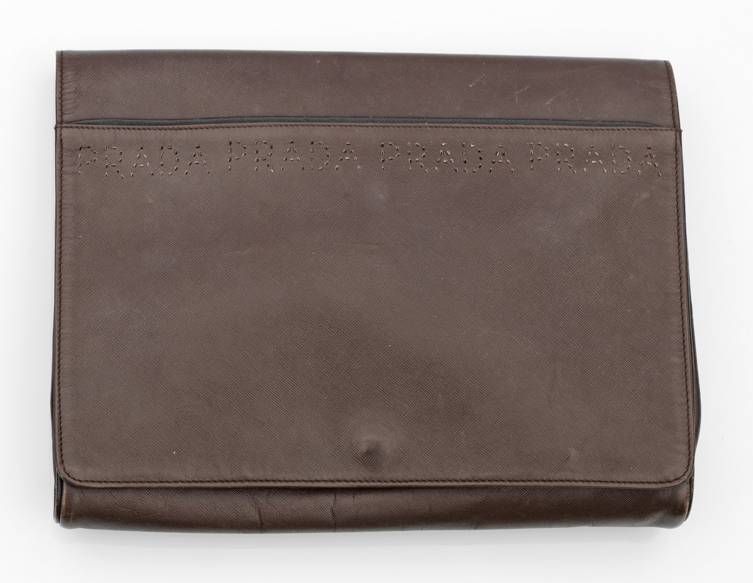 A vintage brown leather clutch by PRADA. Signs of wear. Manufacturer's mark.