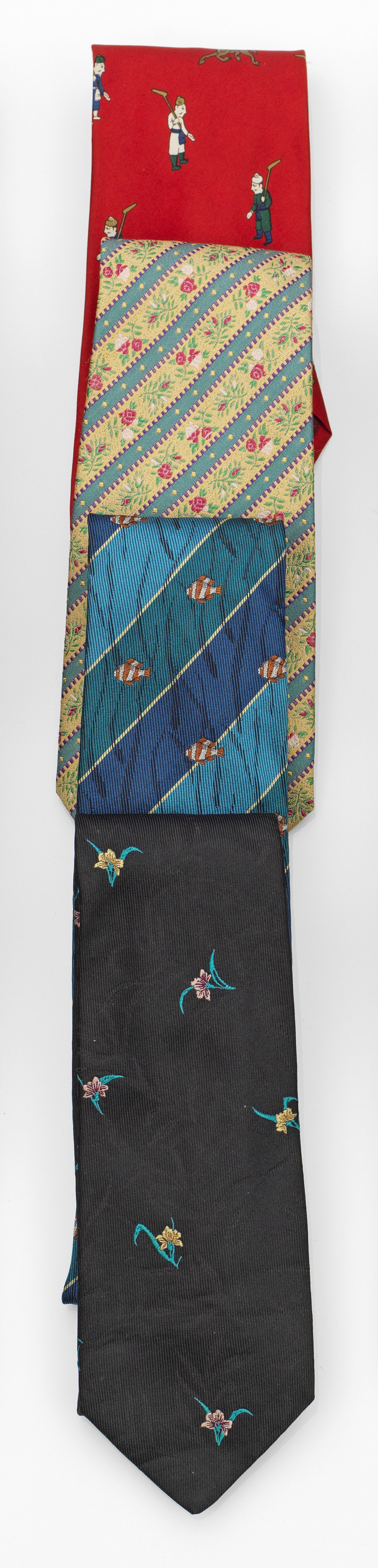 Vier Vintage Designer-Seidenkrawatten von KENZO und Valentino. Seide. Unterschiedliche Blütenmotive als Streifen bzw. auf schwarzem Fond. Fische auf blau-grün gestreiftem Grund sowie Polospieler auf rotem Fond. Herstellerzeichen. Getragen.