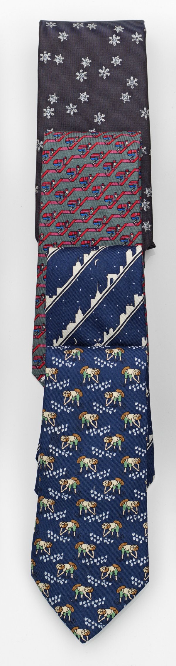 Vier Seidenkrawatten von HERMÈS U. a. Modell 7553 IA, 7163 FA, 7042 TA. Seide. Flächendeckende Musterung aus Reisbauern, stilisierten Silhouetten und Eiskristallen auf blauem Fond sowie stilisierten Jockeys im Rapport auf grauem Fond. Herstellerzeichen. Getragen.