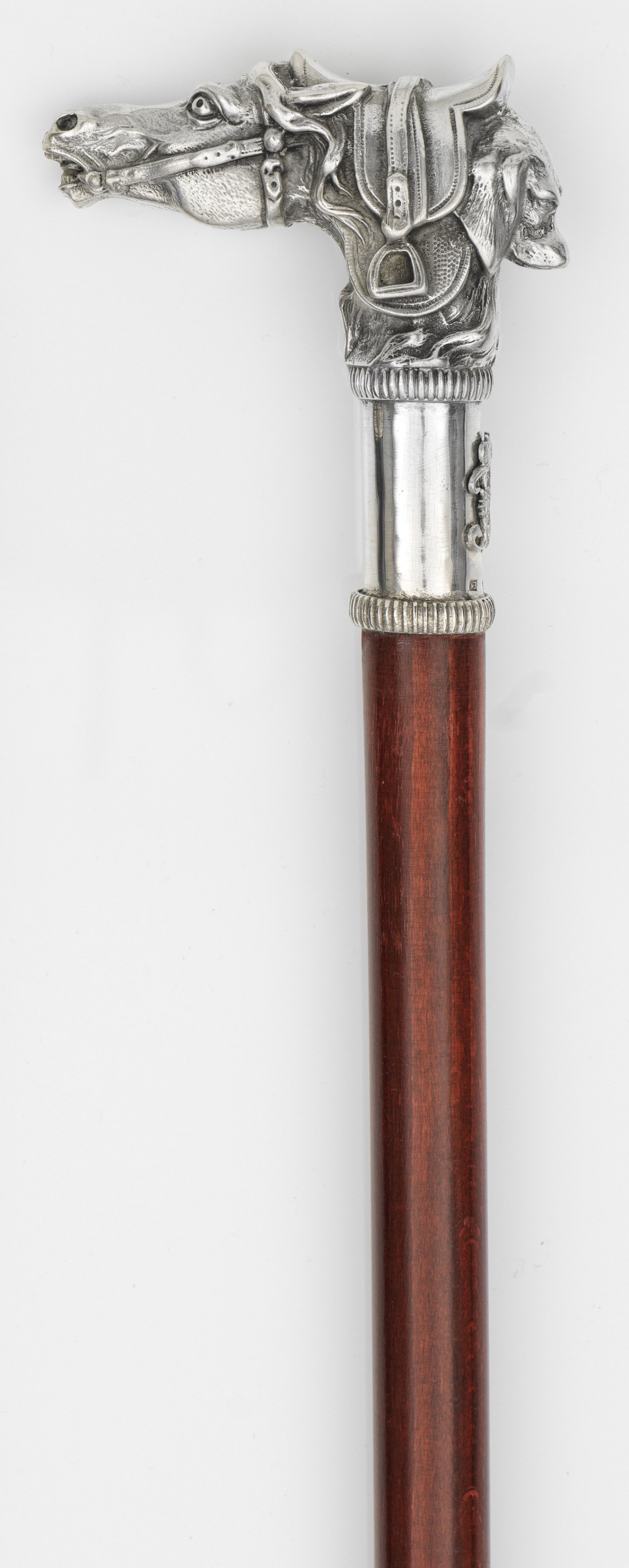 Spazierstock Silber auf rot gefärbtem Holzschaft. Reliefplastischer Knauf in Gestalt eines Hunde- und eines Pferdekopfes mit aufgelegtem Sattel. Mit bekröntem Ziermonogramm. Schaftspitze aus Bein. Gest. 84. L. 94 cm.
