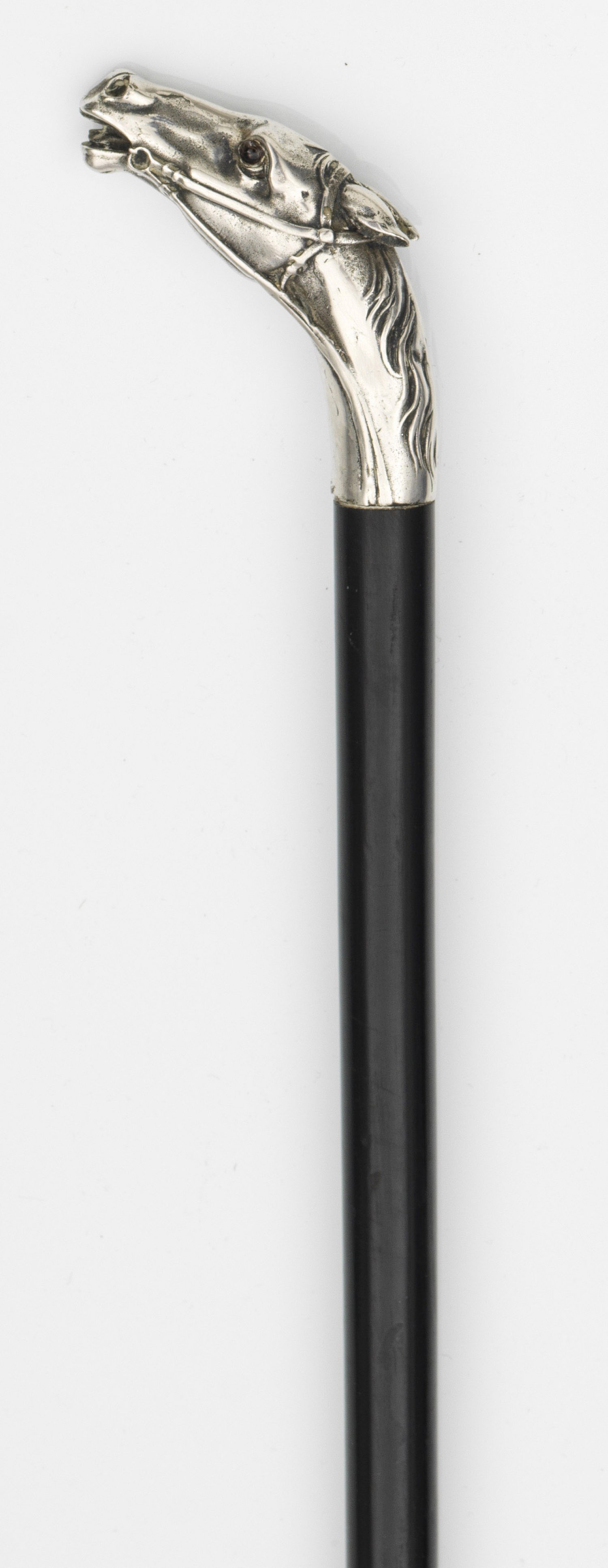 Spazierstock mit Pferdekopf Silber auf ebonisiertem Holzschaft. Plastisch gearbeiteter Griff in Gestalt eines Pferdekopfes. Schaftspitze aus Bein. Undeutl. gest.