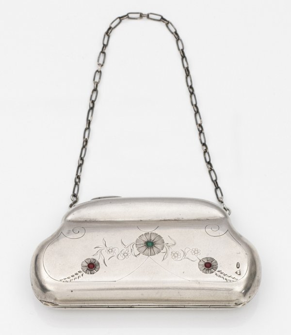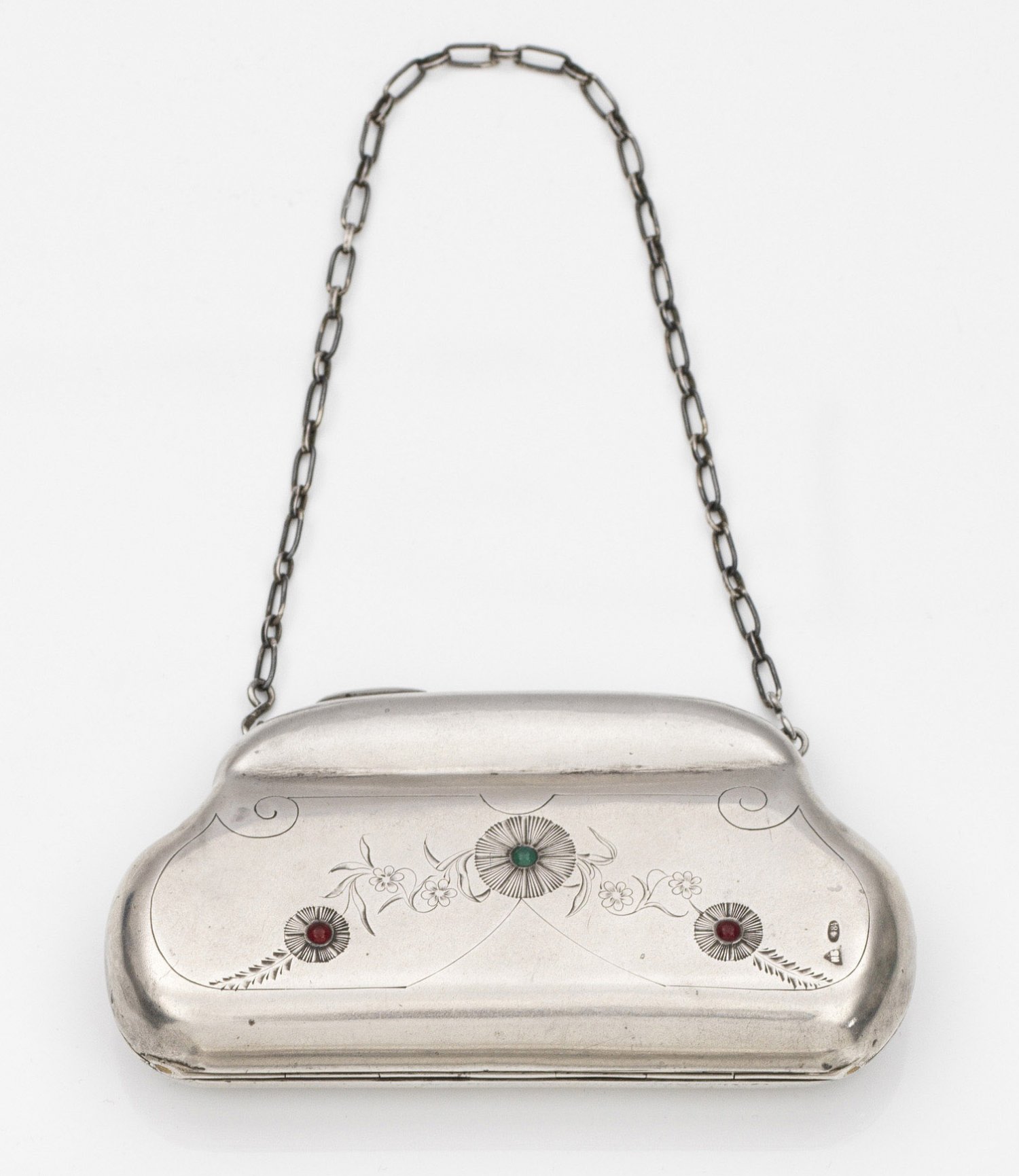 Kleine Abendhandtasche Silber. Passig geschweift mit scharniertem Deckel. Auf der Schauseite verziert mit fein ziseliertem Liniendekor und stilisierten Blattranken und Blüten. Besetzt mit einem grünen und zwei roten Schmucksteinen. Der Drücker mit blauem Cabochon besetzt. Zarte Gliederkette. Im Inneren Reste der Auskleidung. Gest. 88. 13 cm x 7,5 cm.