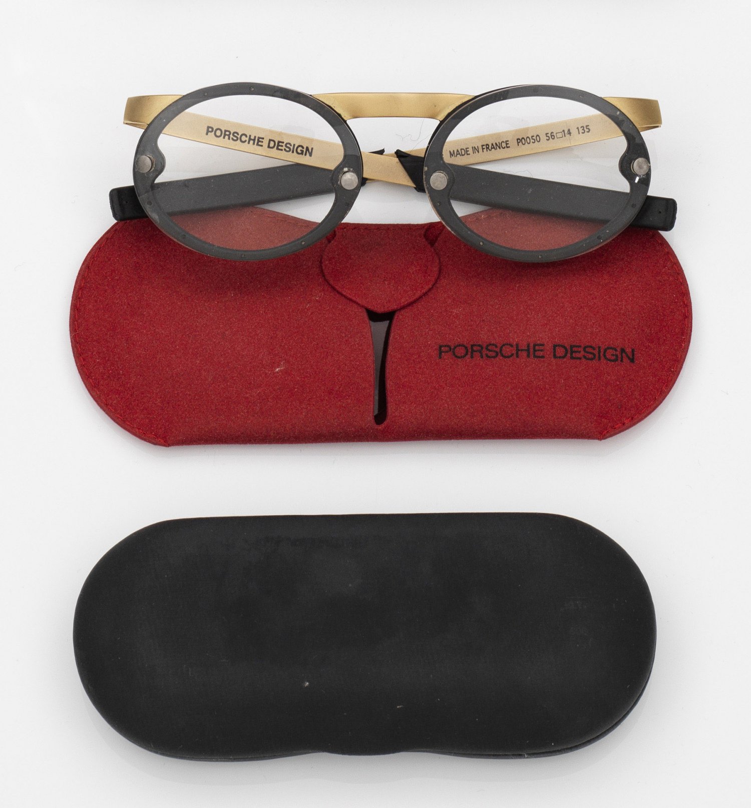 Vintage Sonnenbrille P0050 von Porsche Design Goldfarbenes Metall und schwarzer Kunststoff. Gestell mit gebogten Bügeln sowie ovalen, über einen Magnetmechanismus auswechselbaren Gläsern. Drei Paar Sonnenbrillengläser bez. Porsche Design sowie zwei Paar Gläser mit Sehstärke. Herstellerzeichen.