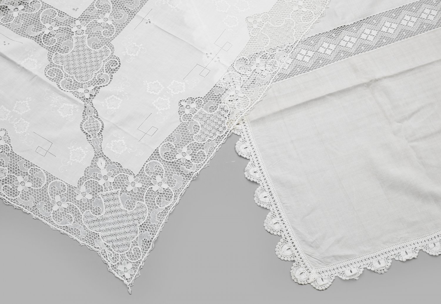 Zwei Tafeldecken mit Spitzendekor Leinen und Baumwolle. Großes, rechteckiges Tafeltuch, gegliedert durch breite, geometrisch angelegte Bahnen aus Häkelspitze sowie umlaufende Bordüre. Monogramm MF 1989. Rechteckiges Tafeltuch in aufwändiger Ajourarbeit aus breiten Partien sog. Burano-Spitze mit Blüten, Arabesken und unterschiedlichen Stegen sowie Dekorationen aus Blüten in Flachstickerei. Monogramm EK. 255 cm x 230 cm bzw. 200 cm x 154 cm.