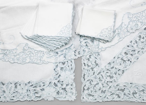 Konvolut Tischwäsche Zwei rechteckige und eine runde Tischdecke sowie 17 Servietten. Weißes Leinen sowie hellblaue Baumwolle in sog. Richelieu-Stickerei. Zwei rechteckige und eine runde Decke mit breitem, durchbrochen gearbeitetem Rand aus schmalen Stegen, Blütenmotiven und Blattwerk. Monogramm MF sowie dat. 1987, 1990 und 1991. D. 167 cm. 235 cm x 152 cm. 300 cm x 165 cm. 12 Servietten: 37 cm x 40 cm sowie fünf Servietten: 34 cm x 34 cm.