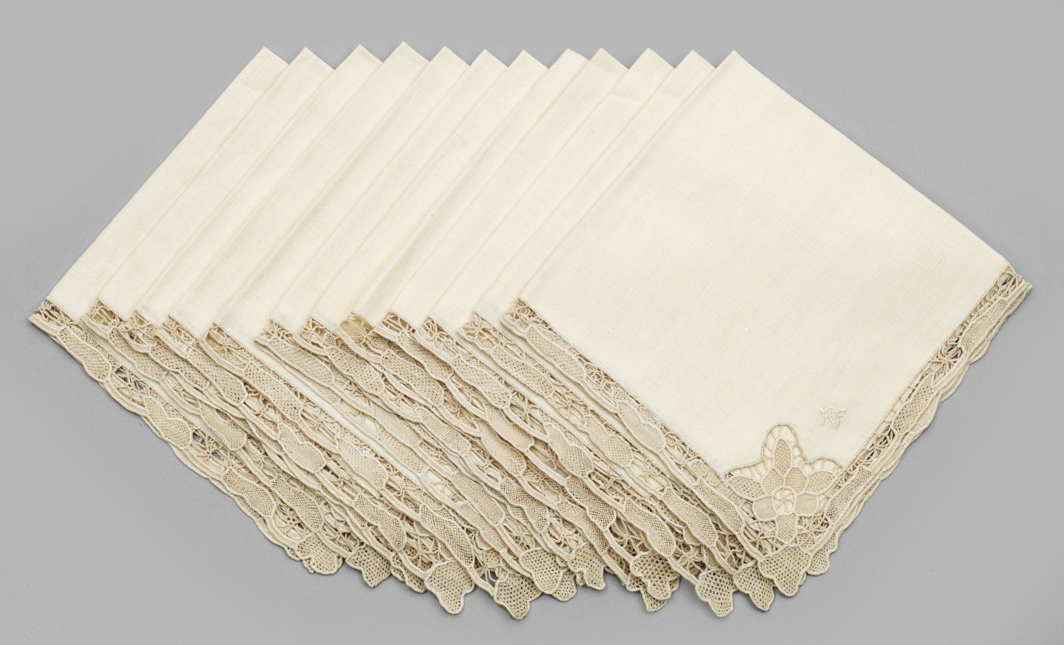 Satz von zwölf Servietten Cremefarbenes Leinen und entsprechende Baumwolle. Durchbrochen gearbeiteter Rand aus schmalen Stegen, Blütenmotiven und Reserven aus fein gearbeitetem Gitterwerk in sog. Richelieu-Stickerei. Monogramm AF. 47 cm x 50 cm.