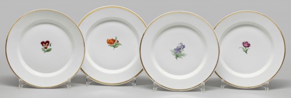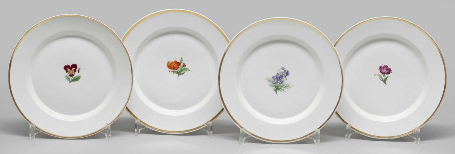 Vier Biedermeier-Zierteller mit Blumendekor Form "Konisch". Im vertieften Spiegel farbiger Blumendekor in polychromer Malerei. Goldrand. Ein Teller am Stand minim. best./Haarriss; Zepter- und Malereimarke. D. 23 cm - 23,5 cm.