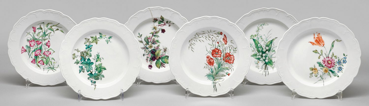 Sechs Zierteller mit Blumendekor Runde Form mit geschweiftem Rand. Reliefdekor "Neuglatt" mit Randbordüre aus Rocaillen und Zacken. Im vertieften Spiegel verschiedene Blumenarrangements und botanische Pflanzen in polychromer Malerei. Teilw. best./Haarriss. Zepter- und teilw. Pfennigmarke. D. 25 cm.