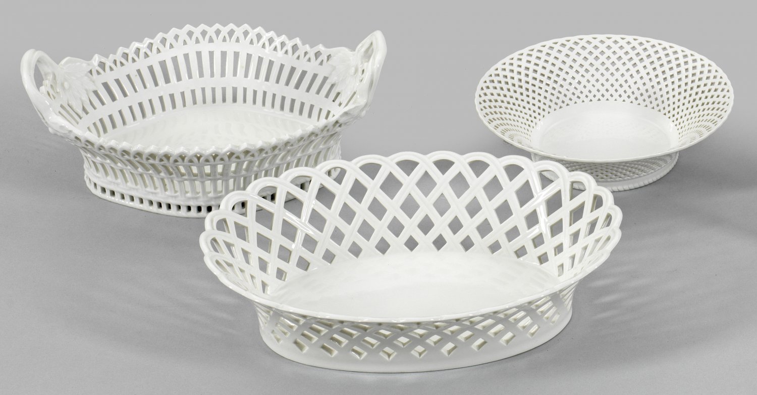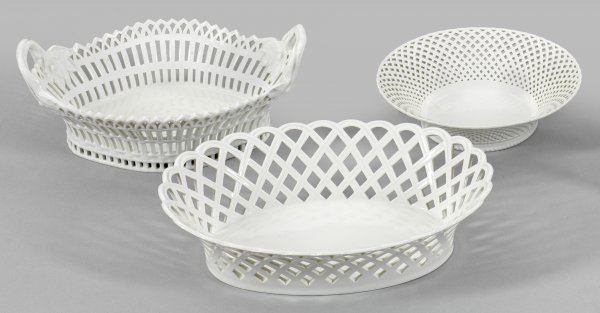 Drei Weißporzellan-Anbietschalen Runde und ovale Form, durchbrochen gearbeitet, u. a. sog. Wegely-Korb und Englischer Gebäckkorb. Entw. Friedrich Elias Meyer, Ernst Heinrich Reichardt, Carl Friedrich Schinkel. Zeptermarke. D. 19 cm. 26 cm - 28 cm x 21 cm x 19 cm.