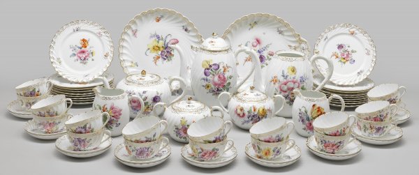 Kaffee- und Teeservice "Gerippt" mit Blumendekor 45-tlg.; Tee-, 2 Kaffee-, 2 Milchkannen, 2 Zuckerdosen, 18 Tassen mit Untertassen, 18 Kuchenteller, 2 Anbietplatten. Schräg gerippte Wandung mit farbenprächtigen Blumenbuketts und vereinzelten, gestreuten Blüten in polychromer Malerei. Umlaufende Goldzackenkante. Entw. Johann Huttig, Hugo Kirsch und Wenzel Hasler. Minim. best.; Ein Deckel fehlt. Manufakturmarke. Kannen-H. 14 cm - 23 cm.