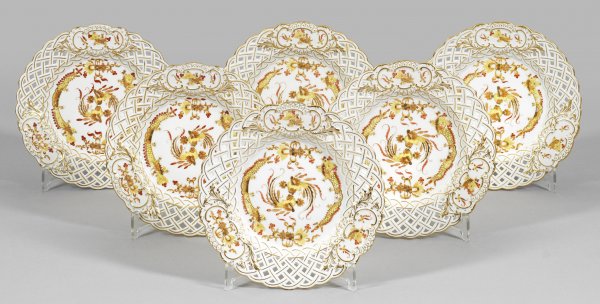 Sechs Zierteller mit Dekor "Gelber reicher Drache" Runde Form. Korbgeflechtartig durchbrochen gearbeitete Fahne mit reliefierten Rocaillekartuschen. Feiner Dekor "Reicher Drache" in gelb-brauner, rotschattierter und goldgehöhter Malerei. Schwertermarke. D. 20,5 cm.