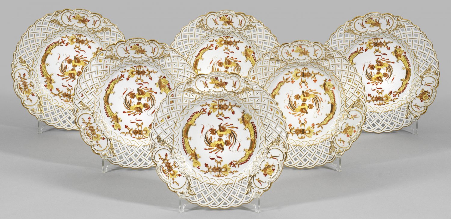 Sechs Zierteller mit Dekor "Gelber reicher Drache" Runde Form. Korbgeflechtartig durchbrochen gearbeitete Fahne mit reliefierten Rocaillekartuschen. Feiner Dekor "Reicher Drache" in gelb-brauner, rotschattierter und goldgehöhter Malerei. Schwertermarke. D. 24 cm.