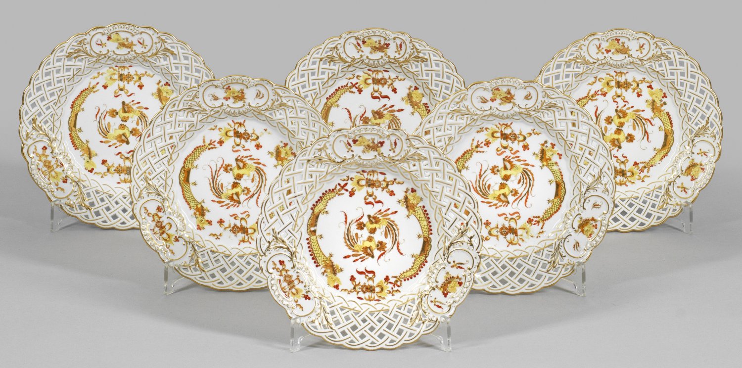 Sechs Zierteller mit Dekor "Gelber reicher Drache" Runde Form. Korbgeflechtartig durchbrochen gearbeitete Fahne mit reliefierten Rocaillekartuschen. Feiner Dekor "Reicher Drache" in gelb-brauner, rotschattierter und goldgehöhter Malerei. Schwertermarke. D. 20,5 cm.