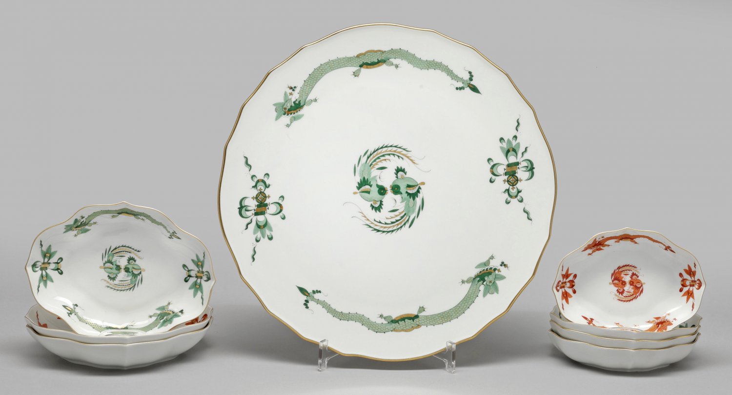 Sieben Konfektschälchen und eine Tortenplatte mit Dekor "Reicher Drache"