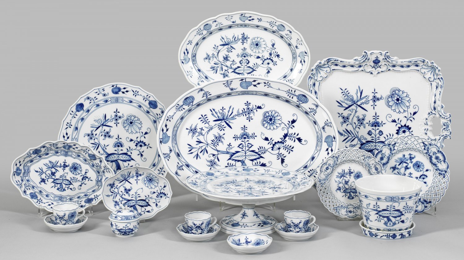 Restservice mit Zwiebelmusterdekor 15-tlg.; 2 Anbiet-, 2 Tortenplatten, Gebäck-, Konfektschale, Tablett, Cachepot mit Untersetzer, 3 Mokkatassen mit Untertassen, Zuckerdose, 2 Kuchenteller. Beigabe: Mokka-Untertasse. Minim. best.; Schwertermarke. Platten 25,5 cm - 34,5 cm x 35,5 - 47,5 cm. D. 31, 5 cm.
