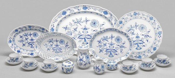 A 14-piece porcelain part set with "Blue onion" pattern. Crossed swords mark.