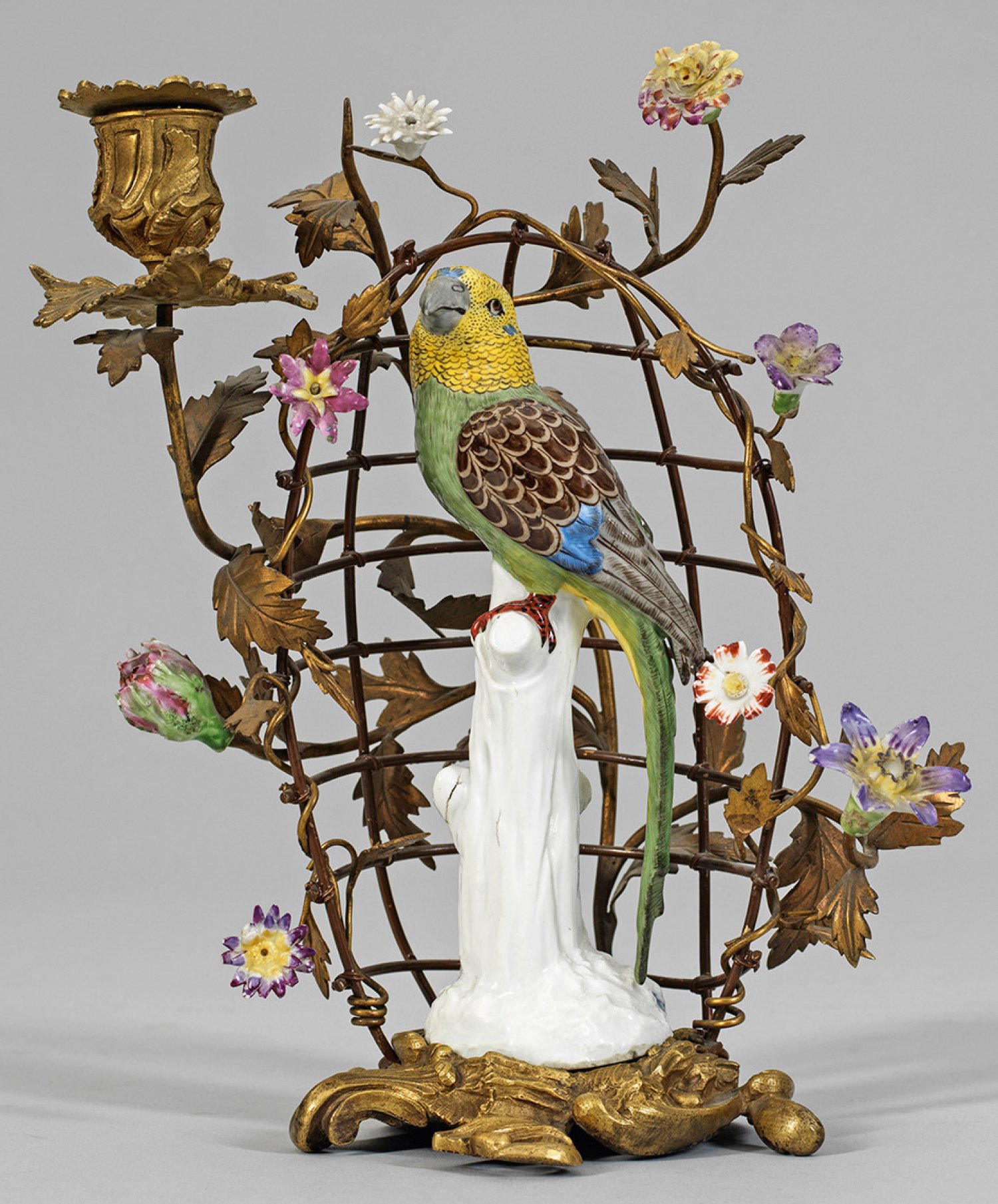 Kerzenleuchter mit Papagei mit Bronzemontierung. Volutenförmiger Sockel mit gitterartiger Laube, umzogen von aufsteigenden Blattranken mit Porzellanblüten. Oberhalb blattreliefierte Tülle über Traufschale. Schauseitig auf einem hohen Baumstumpf sitzender Papagei mit farbenprächtig gestalteter Federzeichnung. Minim. best.; kleine Brandrisse. Manufakturmarke. H. 25 cm.