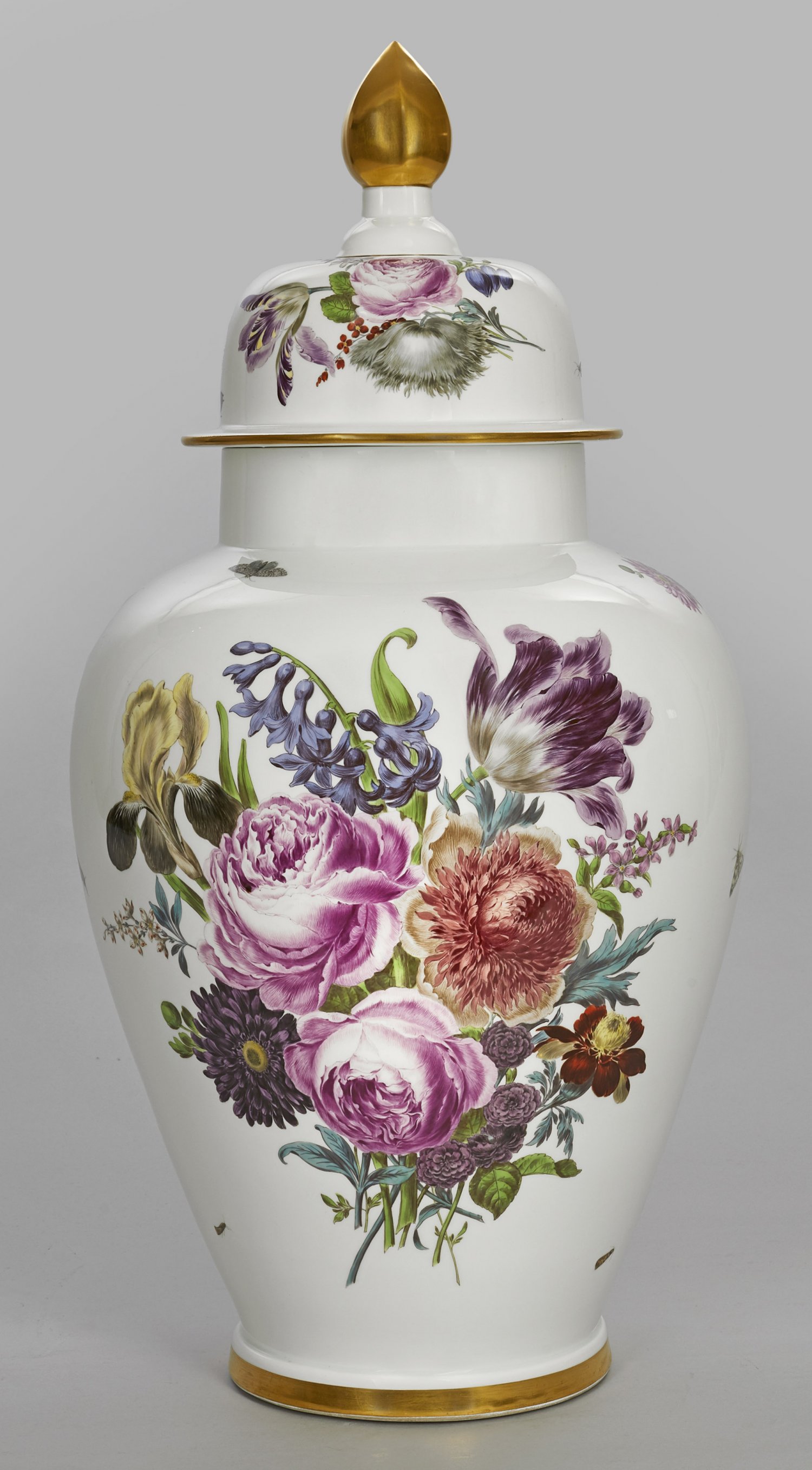 Große prächtige Zierdeckelvase mit Dekor "Deutsche Blume" Über profiliertem Stand balusterförmiger Korpus mit gerundeter Schulter und kurzem, konischem Hals. Übergreifender, haubenförmiger, breitrandiger Deckel, mittig facettierter, pinienförmiger, vergoldeter Knauf. Beidseitig der Wandung und auf dem Deckel farbenprächtige Blumenarrangements aus verschiedenen Blumen, u. a. Rose, Tulpe, Hyanzinthe und Chrysantheme, umgeben von einzelnen Blüten, Schmetterlingen und Insekten. Äußerst feine polychrome Malerei. Goldrand. Schwertermarke. H. 61 cm.
