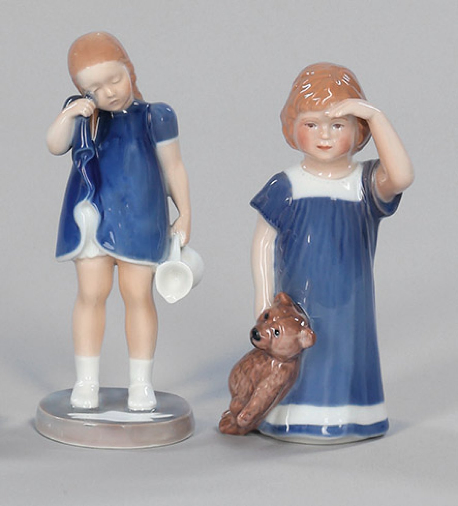 Stehendes, weinendes Mädchen mit ausgelaufenem Krug sowie Mädchen mit Teddybär. Am Boden verschüttete Milch. Polychrome Unterglasurmalerei. Entw. Ingeborg Plockross-Irminger und Clair Weiß. Modell-Nr. 676 und 466. Manufakturmarke. H. 16,5 - 18 cm.