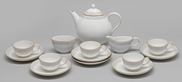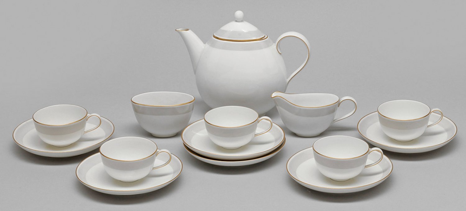 Mokkaservice 8-tlg.; Mokkakanne, Sahnegießer, Zuckerdose, 5 Tassen mit Untertassen. Schmale, ovale Form. Hellgrauer, breiter Dekor- sowie Goldrand. Entw. Trude Petri. Teilw. Jahreszeichen. Zepter- und Malereimarke. Kannen-H. 15 cm.