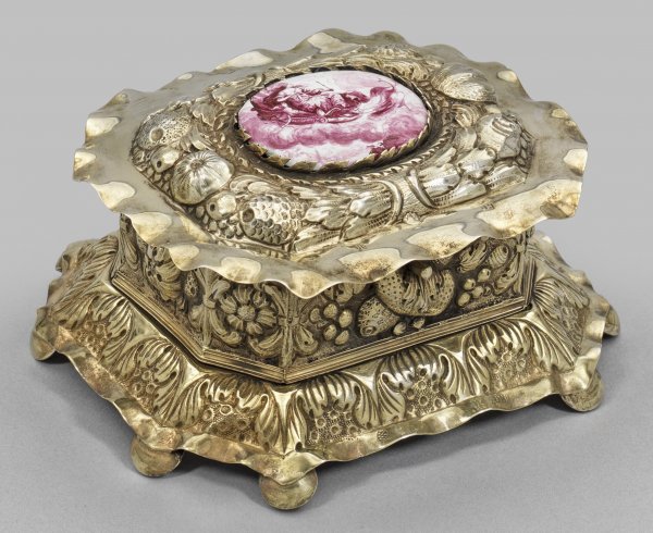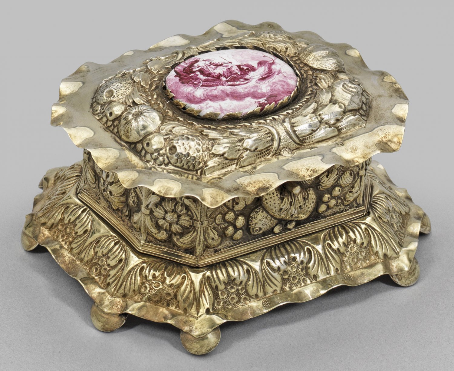 Kleine Barockschatulle Silber, vollvergoldet. Über acht ellipsenförmigen, schräggestellten Füßen ein weit ausgestellter, wellenförmig gebogter Sockel mit punziertem und getriebenem Blattfries. Darüber ein achtkantiger, am Rand profilierter Korpus mit reliefplastisch gearbeitetem, üppigem Früchte-, Blüten- und Volutendekor. Ein weit überstehender, gewölbter und scharnierter Deckel mit glattem, wellenförmigem Rand. Mittig auf dem Deckel ein von Blättern eingefasstes Emailmedaillon, umgeben von einem reliefplastisch gestalteten Kranz aus Blattranken und Früchten. Auf dem Medaillon, in feiner, purpurfarbener Emailmalerei vor weißem Hintergrund die Darstellung der römischen Göttin Juno über den Wolken, in einem von Pfauen gezogenen Muschelwagen sitzend. Gest., Tremolierstrich, Stadtmarke, Meister Johann Haltenwanger (wird Meister 1684). Gew. ca. 225 g. H. 7 cm. 13,5 cm x 11,5 cm.