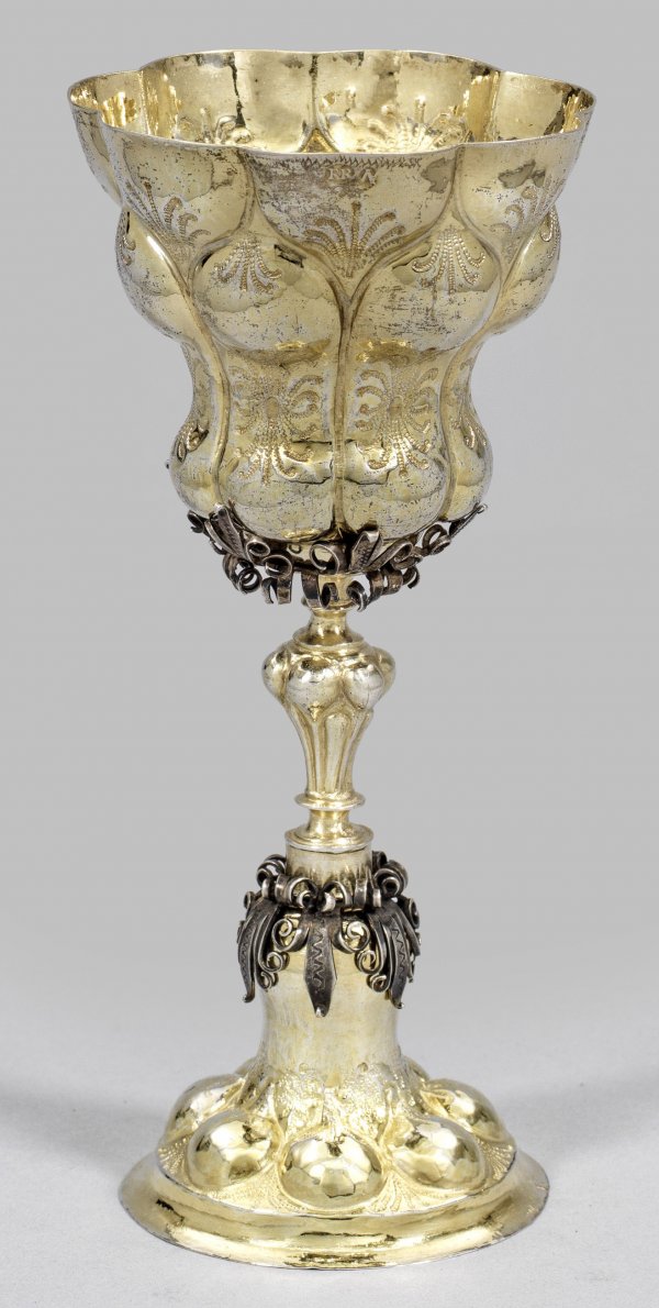 Nürnberger Akeleipokal Silber, vergoldet. Umlaufend gebuckelter, gewölbter und hochgezogener Stand. Kurzer, teilw. mit gebuckeltem Dekor gestalteter Balusterschaft, ober- und unterhalb begrenzt von ziselierten, blattartig gearbeiteten, teilw. eingerollten Silberfäden. Darüber eingezogene Kuppa, umgeben von Buckeln. Korpus akzentuiert von punziertem und ziseliertem Palmettendekor. Gest., Tremolierstrich, Beschauzeichen, Stadtmarke, eine undeutl. Marke am Stand, Meister Reinhold Rühl (wird Meister 1652). Gew. ca. 118 g. H. 17 cm.