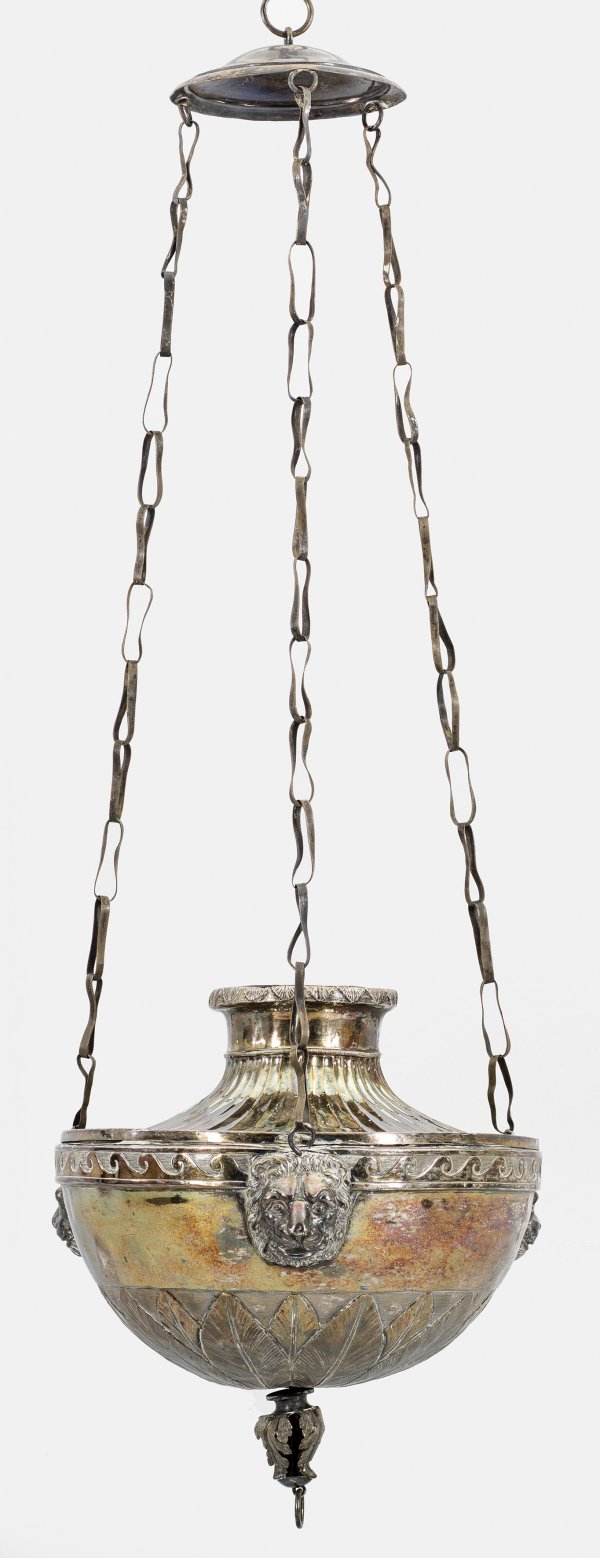 Klassizistische Deckenlampe Silber. Balusterförmiger Korpus mit geschweift ansteigendem, kanneliertem oberen Abschluss. Umlaufend der Wandung reliefiertes Blattwerk sowie schmaler Fries aus Wellenband. Vollplastisch gestaltete Löwenmaskarons, davon ausgehend Aufhängung aus Kettengliedern. Gest., Beschauzeichen. Eine Punze undeutl.; H. 81 cm. D 28 cm.