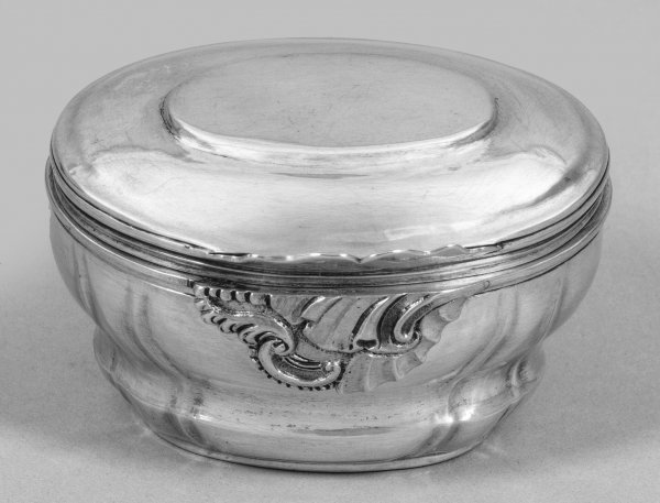 Schälchen mit einsetzbarer Dose Kleine Dose, einsetzbar in passig geformtes Schälchen. Ovaler, sich zum Rand hin erweiternder Korpus. Wandung durch wellenförmige Züge gegliedert. Scharnierter, flacher, zur Mitte hin oval gewölbter Deckel mit mehrfach profiliertem Rand. Geschwungene, schmale Daumenrast, u.a. mit reliefplastischem Muschelwerk und Rocaillen verziert. Gest., Stadtmarke, undeutl. Meistermarke. Gew. ca. 140 g. H. 5 cm. 8,5 cm x 7 cm.