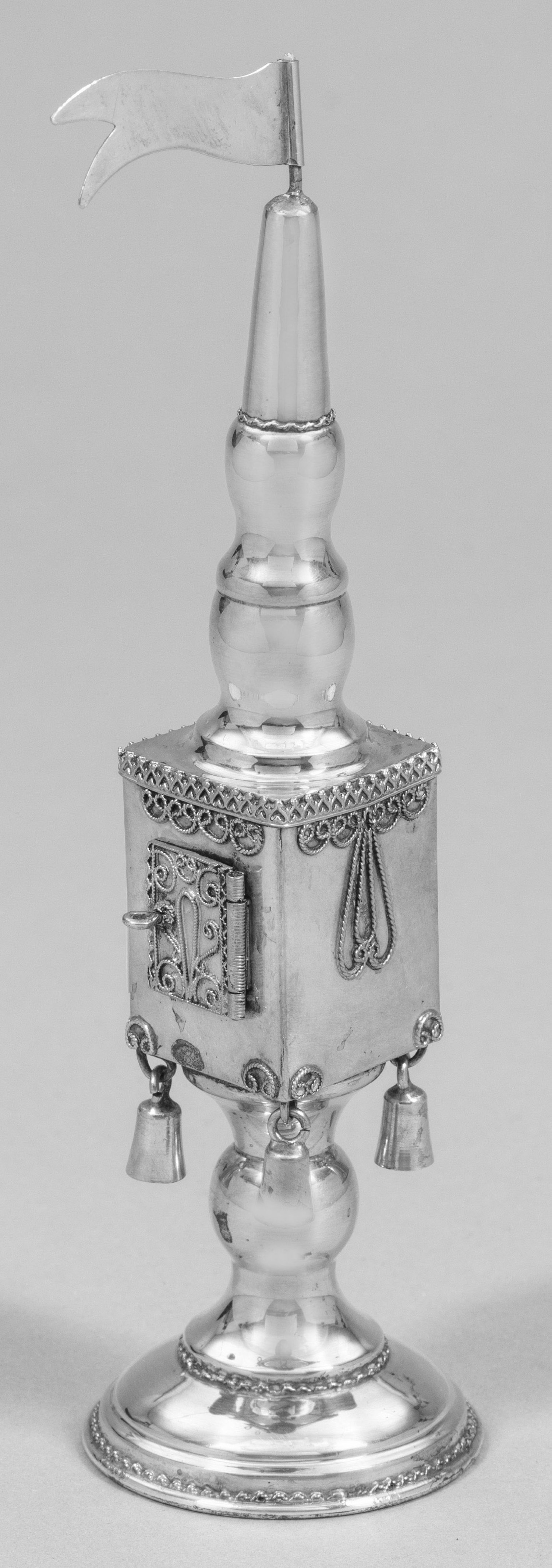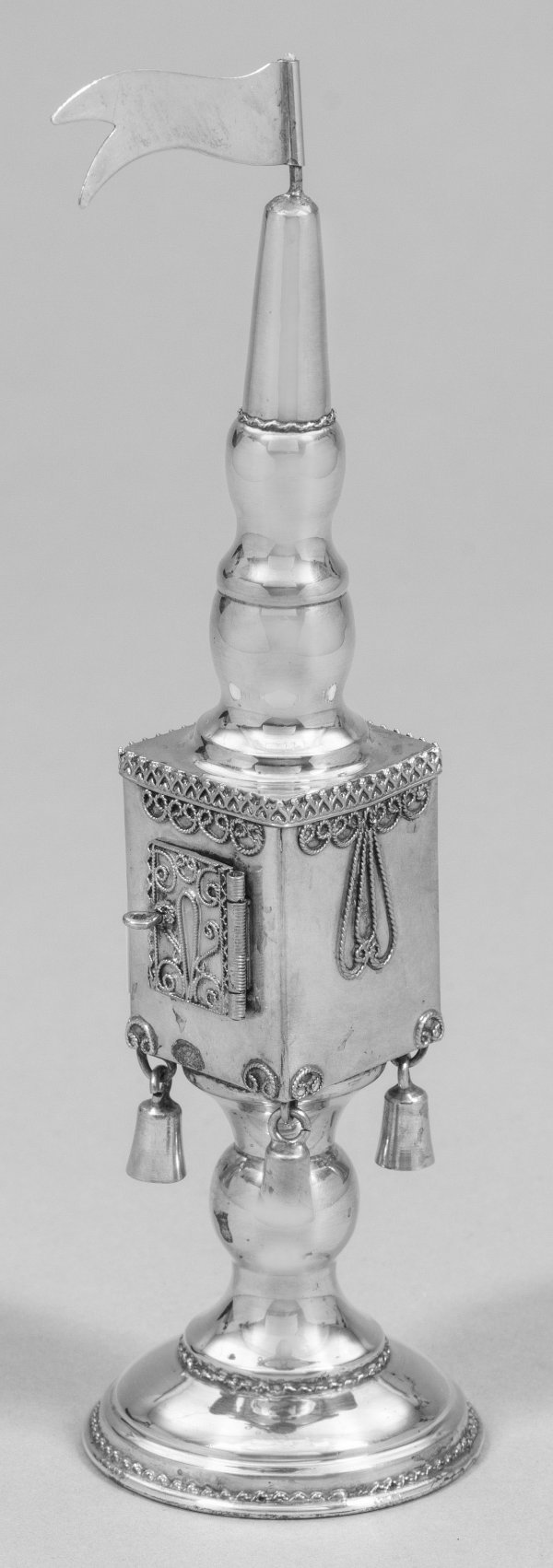 Besamimtürmchen Silber. Zentrales, von einem Turm bekröntes, filigran mit Kordelbändern verziertes Duftgefäß mit kleiner, scharnierter Tür. Bekrönt von einer beweglichen Fahne. Mit vier stilisierten Glöckchen. Gest. ST 925. Gew. ca. 107 g. H. 21,5 cm.